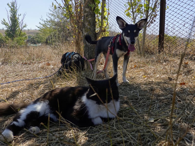 In der Interaktion mit anderen Hunden zeigt sich Anouk sehr sozial und orientiert sich gerne an ihnen. Auch Katzen begegnet sie freundlich – wenn auch manchmal noch etwas stürmisch, was mit liebevoller Anleitung und ein wenig Training jedoch gut lenkbar sein dürfte.