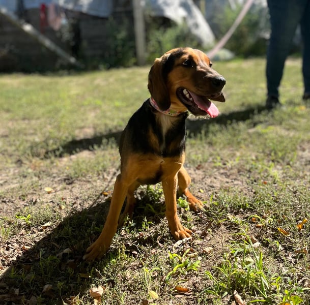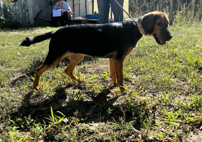 Die junge Hündin ist sehr menschenlieb und aktiv. Typisch Junghund möchte sie am liebsten immer und mit allen Spielen. Die Welt zu erkunden steht ganz oben auf ihrer Liste. Selbstverständlich muss sie - allein schon durch ihr Alter - noch viel lernen, aber diese hübsche Brackenmaus wird sich sicher ganz toll entwickeln. Zu anderen Hunden ist sie teilweise recht forsch, vertägt sich aber mit allen.
