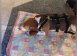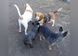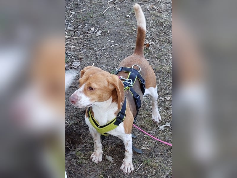 Achtung, hier kommt Wirbelwind Dana! Dana sieht aus wie ein Beagle, ist aber definitiv ein Mix. Sie hat ein welpentypisches Verhalten und muss noch erzogen werden. Sie ist verspielt, agil, neugierig, ein sehr aktiver Hund. Wahrscheinlich durfte sie all das vorher niemals ausleben, muss es jetzt nachholen und ist somit voller Power. Dana sollte nur in hundeerfahrene Hände vermittelt werden, denn sie ist gerade am Anfang ängstlich und geht bei Kontakt mit Menschen erstmal in den Fluchtmodus. Je mehr Menschen, umso mehr Angst. Dana muss gut gesichert werden mit Sicherheitsgeschirr und Leine, denn auch unbekannte Situationen erschrecken sie schnell, sodass sie dann sofort weglaufen möchte. Dazu hat sie rassetypisch einen starken Jagdtrieb. Sehr gerne hätte Dana einen sicher eingezäunten Garten, den sie ausgiebig erkunden und wo sie ihre Geschwindigkeit testen kann. Sie muss körperlich und geistig ausgelastet werden und braucht täglich regelmäßig Bewegung und Beschäftigung. Dana braucht auf jeden Fall einen Hundekumpel (oder auch mehrere) in ihrem neuen Zuhause, an dem bzw. denen sie sich sehr orientieren kann. Einen Hund oder Hunde, die gern und viel spielen und ihre Tobeangebote annehmen. Nach Spiel und Spaß kommt Dana gut zur Ruhe. Sie liebt weiche Kissen und Decken. Dana ist stubenrein und kann mit einem/mehreren Hundekumpel(s) eine kurze Zeit allein bleiben. Vorher sollte sie sich ausgetobt haben. Mit Katzen kommt sie bestens zurecht. Diese sollten Hunde kennen und entspannt mit Hunden umgehen.