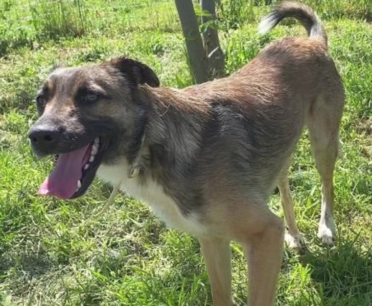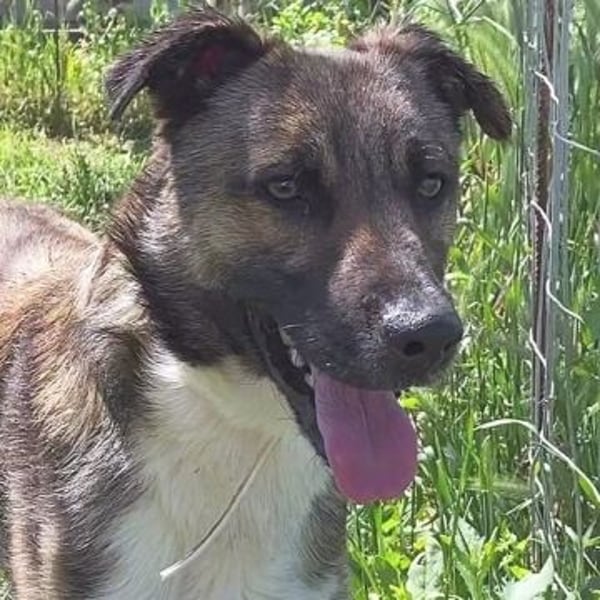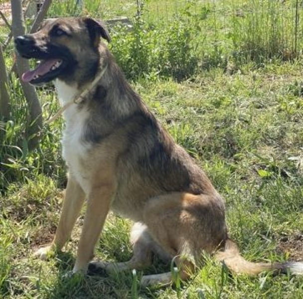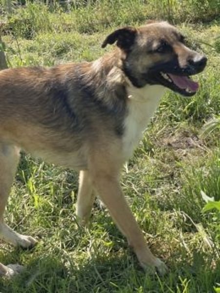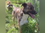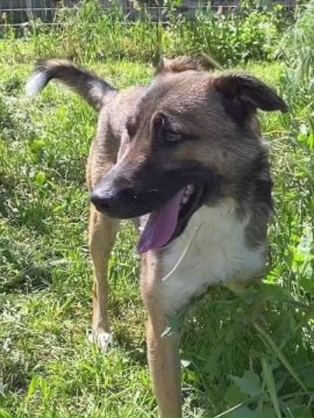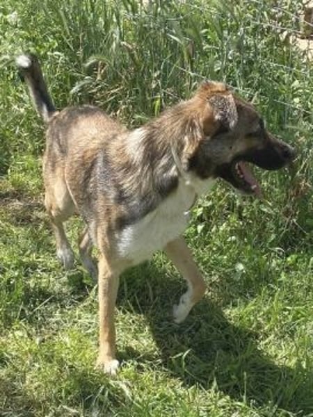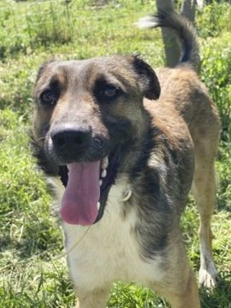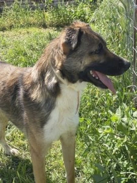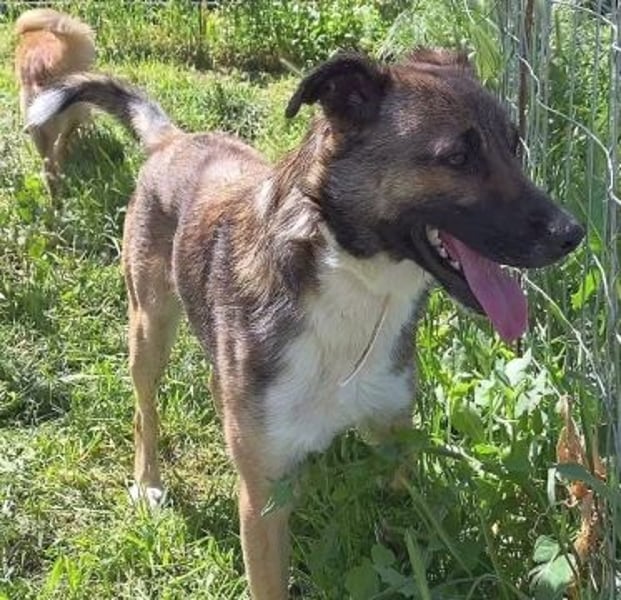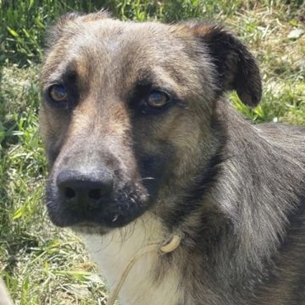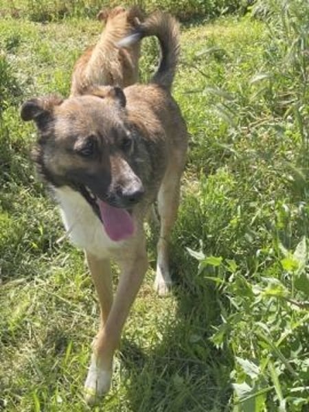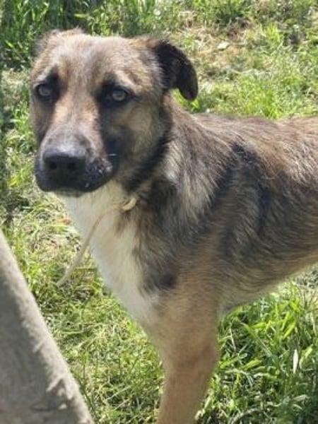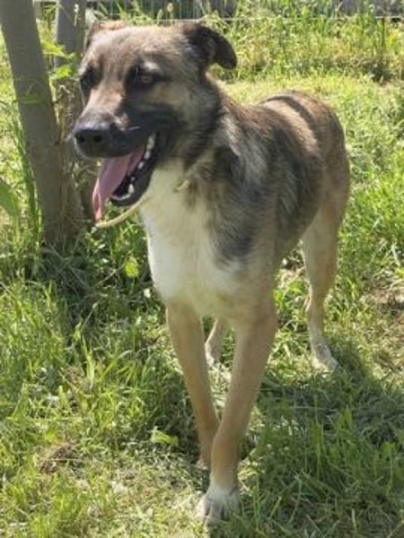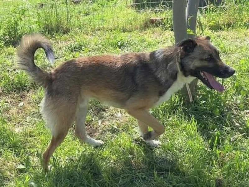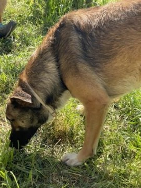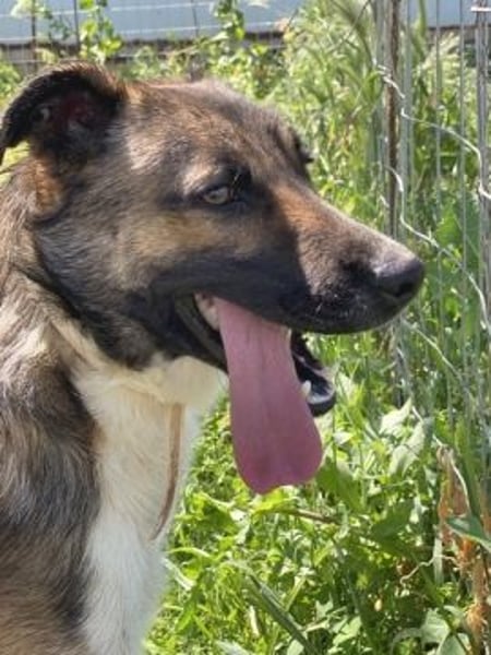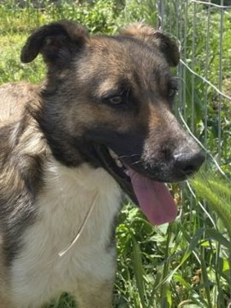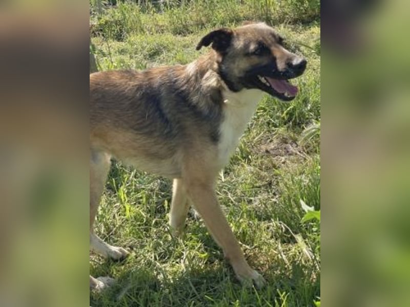 Logan sieht aus wie ein Mini-Schäferhund-Mix. Er ist inzwischen ausgewachsen und hat gerade einmal eine Schulterhöhe von etwa 48 cm. Auf den Fotos sieht er irgendwie immer größer aus… aber tatsächlich hat er eher die Statur wie ein kleines Reh. Als wir Ende April 2024 auch Logan und seinen Freund Brandy besuchten, waren wir ganz verzaubert von diesem besonderen kleinen Hundemann: was für ein hübscher kleiner Kerl mit sanftem zurückhaltenden Wesen. Er war aufgeregt, als wir mit ihm und Brandy in einem kleinen Auslauf waren. Er schien Angst zu haben dort nicht mehr heraus zu kommen. Aber mit der Zeit wurde er ruhiger und nahm auch Leckerlis aus der Hand.