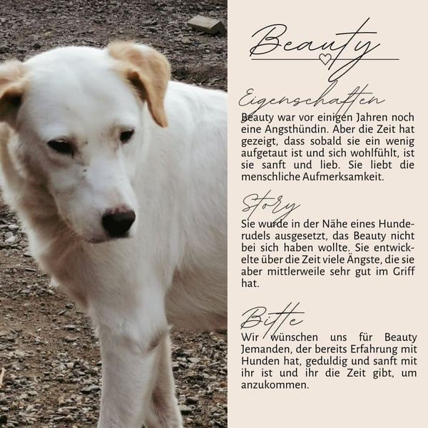 Wir freuen uns, wenn BEAUTY bald eine liebevolle Familie findet, die ihr die Wärme und Geborgenheit schenkt, die sie verdient.