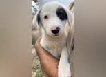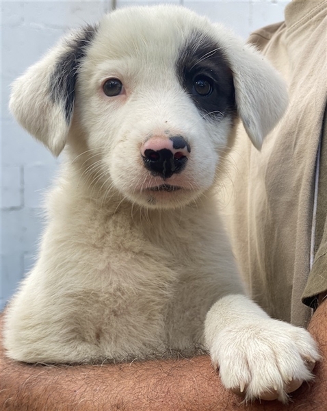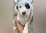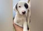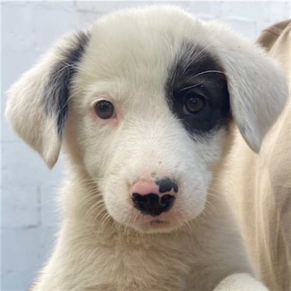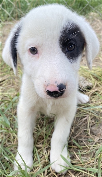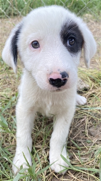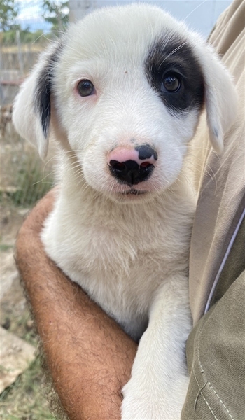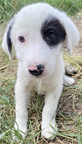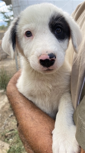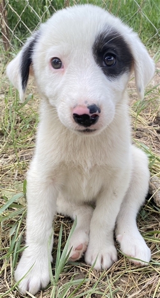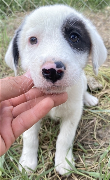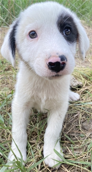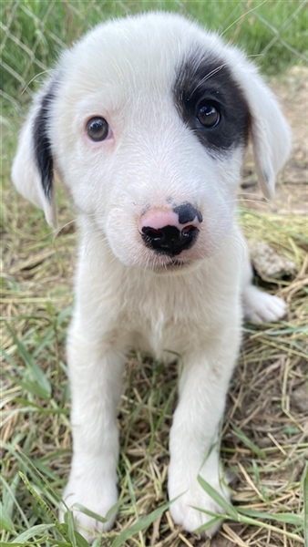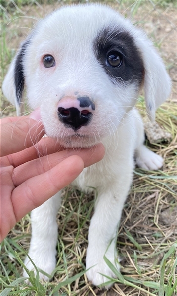 Kiba hat wie Schwesterchen Joy eine „Augenklappe“, jedoch ist es hier das linke Auge, das schwarz eingerahmt ist. Ihr rechtes Schlappöhrchen hat ebenfalls einen schwarzen Fleck, der einen schönen Kontrast zu ihrem weißen Fellkleid bildet. Wie ihre Geschwister ist auch Kiba ein aufgeweckter Welpe, der neugierig alles erkunden möchte und sich sehr über menschliche Nähe und Zuwendung freut. Jedoch sind Streicheleinheiten selten, da auf der Pflegestelle viele weitere Hunde versorgt werden müssen. Mit diesen kommt die hübsche Kiba gut zurecht. Am liebsten spielt sie aber natürlich mit ihren Geschwistern.
