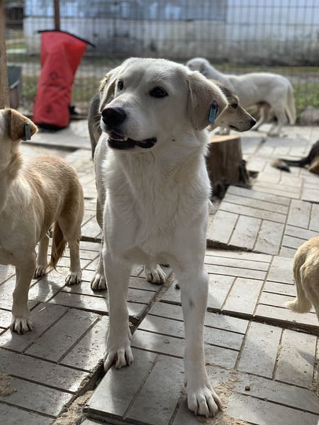 Janosch hielt sich, wie fast alle anderen in seinem Zwinger, erst einmal zurück und schaute, was wir denn so von ihm wollten. Unsere mitgebrachten Leckerlis fand er aber gut und kurz darauf durften wir ihn auch streicheln. Genießen konnte er es aber noch nicht so richtig, denn er schien es einfach nicht zu kennen. Er blieb während unseres Besuch stets ruhig und gelassen. Janosch wird etwas Eingewöhnungszeit benötigen und dann wird aus ihm sicherlich ein prima Begleiter. Er scheint ein Labrador-Mix zu sein und hat keine Rute.