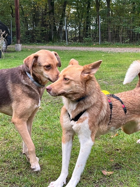 Andorra ist eine agile Junghündin, die sich schnell in das bestehende Rudel integriert hat. Sie ist verträglich mit anderen Hunden und wäre auch als Zweithund geeignet. Andorra ist sehr interessiert und neugierig. Sie konnte hier schon viel lernen und ist z.B. mittlerweile stubenrein und leinenführig. Gibt man ihr etwas Zeit, eine Bindung aufzubauen, zeigt sie sich verschmust. Andorra ist ein Rohdiamant, der mit Bindungsarbeit und Geduld noch etwas geschliffen werden möchte. Eine ruhige, nicht städtische Umgebung wäre optimal.