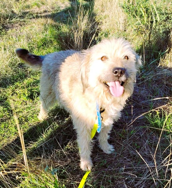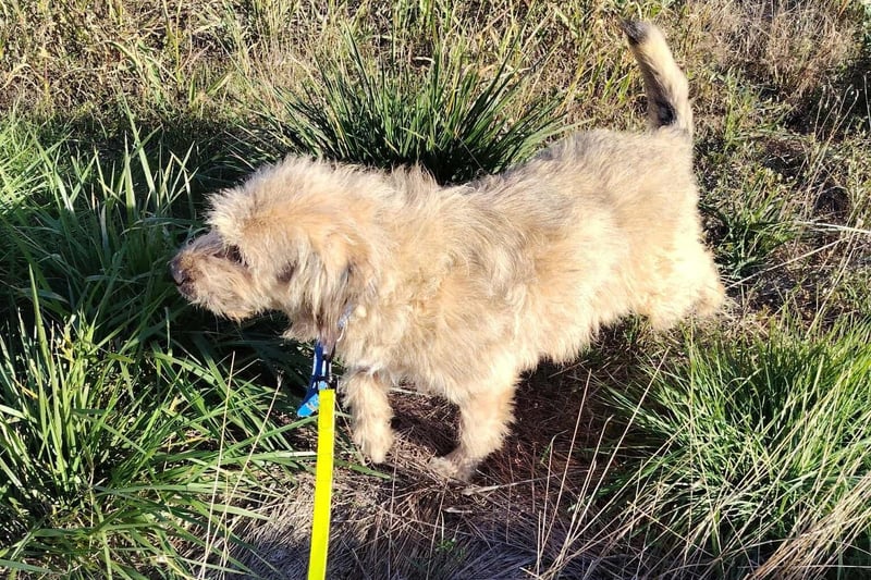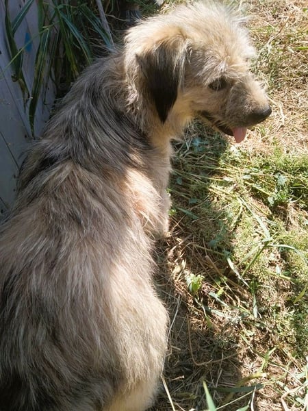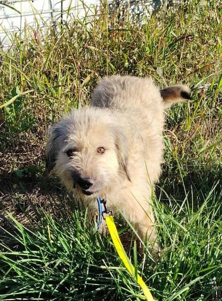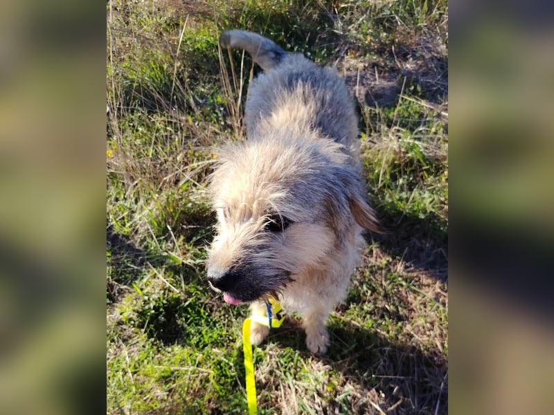 Der cremefarbene Strubbel-Bub mit den dunkelgrauen Haaren an den Ohrspitzen, an der Rute und vereinzelten am restlichen Körper, ist ein richtig Hübscher, der sich ruckizucki in die Herzen mogelt.
