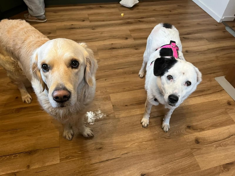 Mit dem Hund der Pflegestelle versteht sich Carla sehr gut. Mit ihm zusammen kann Sie bereits mehrere Stunden alleine bleiben.