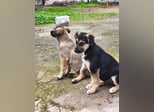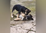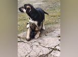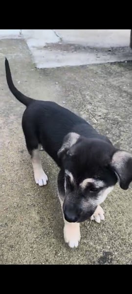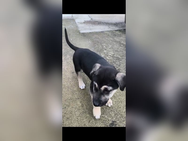 Theo ist ein etwa vier Monate alter, schwarzer Welpe, der gemeinsam mit seinem Bruder und seiner ängstlichen Mama an einer Tankstelle direkt an einer vielbefahrenen Straße gefunden wurde.