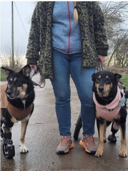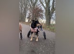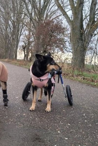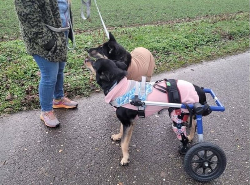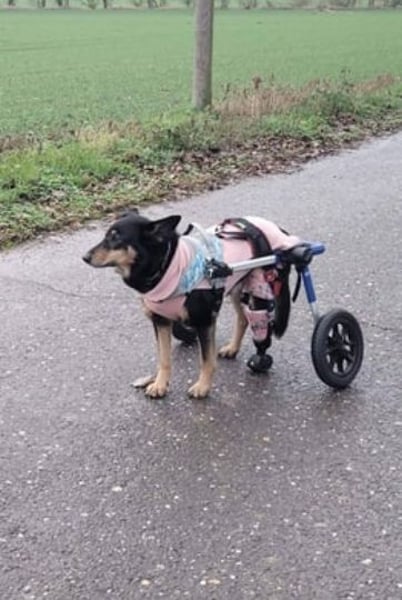 Im Juli 2025 zog Niki auf ihre Pflegestelle in Deutschland und fasste dort schnell Vertrauen – auch in die vorhandene Hundegruppe. Sie wurde sofort auf Diät gesetzt, mit Bewegung im Rollstuhl und Unterwasserlaufband unterstützt und hat bereits 6 Kilo abgenommen. Ihre Kondition verbessert sich stetig und sie bewegt sich inzwischen gerne und viel. Tierärztliche Untersuchungen zeigten, dass Niki mehrfach beschossen wurde; aktuell wird von einer Operation abgeraten. Im August reiste sie nach Thüringen, wo Abdrücke für ihre Prothese genommen wurden – auch das meisterte sie souverän. Niki ist ein fröhlicher, verschmuster Quatschkopf, der Menschen, Hunde und sogar Katzen liebt. Nun warten sie und ihre Pflegefamilie gespannt auf ihr neues „Beinchen“.
