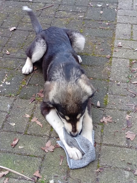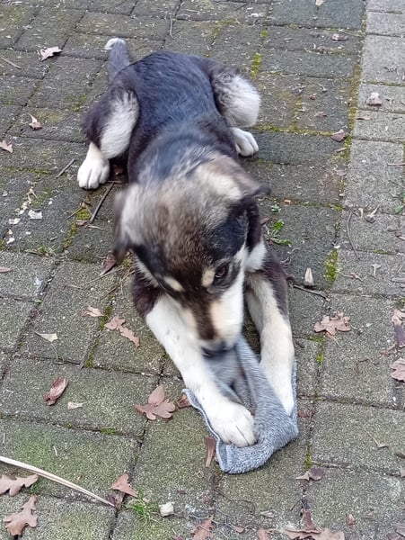 Sie lernt gerade fleißig, sich bemerkbar zu machen, wenn sie raus muss, und stellt sich dafür schon ganz vorbildlich an die Terrassentür. Natürlich kann es als Welpe noch mal passieren, dass sie beim intensiven Knabbern an ihrer Kaustange kurz alles um sich herum vergisst – aber Übung macht den Meister.