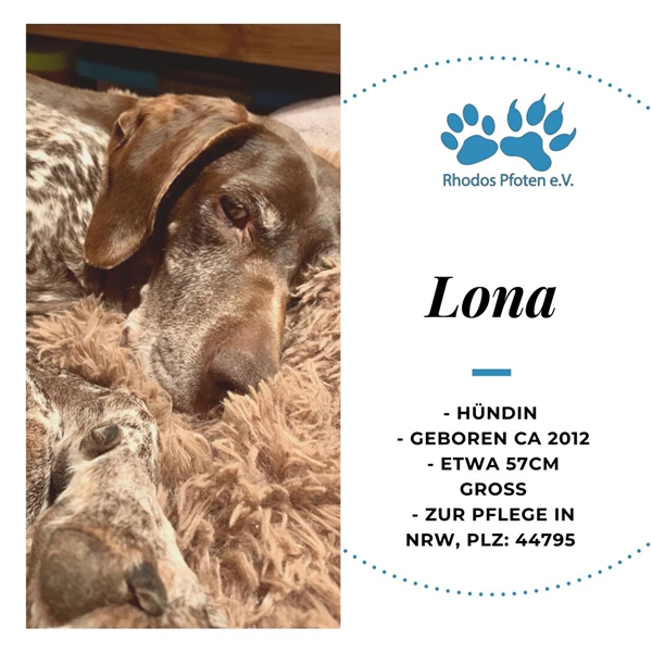 Hallo ich bin Lona, etwa neun Jahre alt und Ende Oktober in eine Pflegestelle in Bochum gezogen. Nachdem sich die erste Aufregung gelegt hat, fühle ich mich langsam wohl. Die letzten fünf Jahre habe ich auf Rhodos in einem Tierheim gelebt, nachdem ich an einem Baum gebunden ausgesetzt wurde.