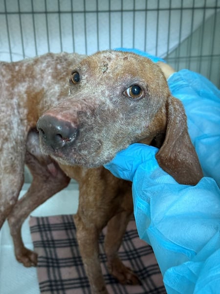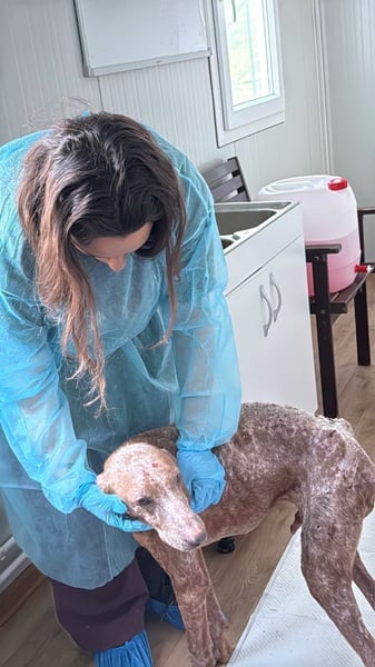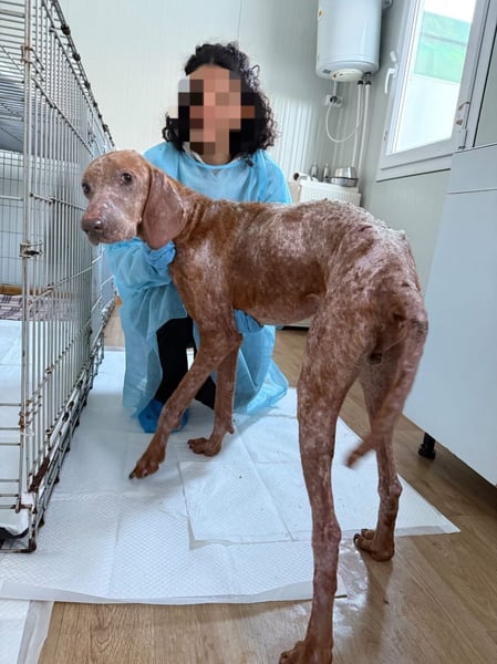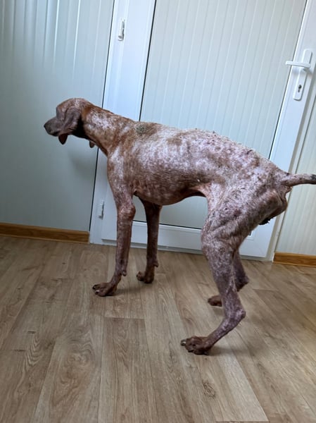 Als er von den rumänischen Tierschützern gefunden wurde, war sein Zustand kaum zu ertragen. Sein abgemagerter Körper bestand nur noch aus entzündeten, offenen Wunden, er hatte fast kein Fell mehr. In seinem Kot und Urin war Blut. Er war extrem geschwächt & konnte vor Schmerzen kaum liegen.