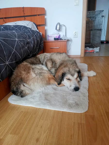 Er verbringt einen Großteil des Tages schlafend und fordert von sich aus nur wenig Aktivität ein. Er drängt nicht darauf, häufig nach draußen zu gehen, und wirkt insgesamt sehr genügsam und entspannt, liebt die Couch und sein warmes Bettchen. Sauberkeit bereitet ihm keine Probleme. Er hat es inzwischen gelernt (zusammen mit den anderen Tieren) ein paar Stunden allein bleiben, die durchschnittliche Dauer liegt bei etwa 3-4 Stunden, kann aber je nach Situation variieren. Dennoch mag er das Alleinsein nicht besonders und bellt anfangs, beruhigt sich jedoch anschließend.