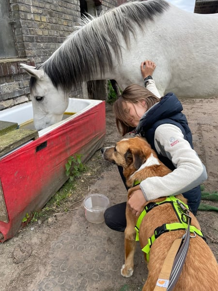 Draußen zeigt sich Kimbo noch wachsam und reaktiv gegenüber Artgenossen. Fremde Hunde verunsichern ihn und er versucht, sie durch Bellen, Knurren oder Jaulen auf Abstand zu halten. Er übernimmt dabei instinktiv die Rolle des Beschützers - aus Unsicherheit, nicht aus Aggression. Mit konsequentem Training, klarer Führung und viel Geduld konnten bereits zwei Hunde erfolgreich in sein Umfeld integriert werden, mit denen nun gemeinsame Spaziergänge möglich sind. Das zeigt deutlich, dass Kimbo mit der richtigen Unterstützung gute Fortschritte macht und noch vieles lernen kann.