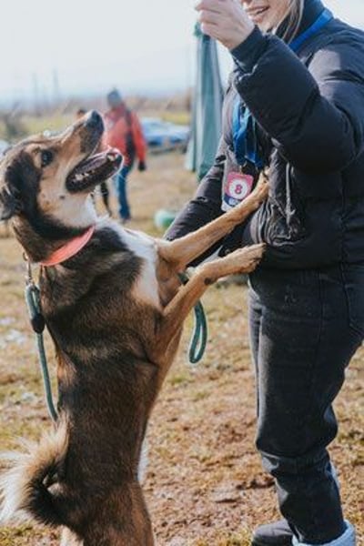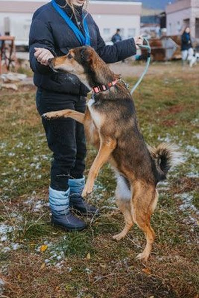 Sobald sie den Zwinger verlässt, stürmt sie los, oft fast nur auf den Hinterpfoten. Trotz ihres Tempos reagiert sie häufig auf Ansprache, bleibt stehen oder wechselt die Richtung – selbstverständlich immer noch voller Eifer. Leinenführigkeit gehört bisher nicht zu ihren Stärken, was vor allem daran liegt, dass sie ein energiegeladenes Temperament hat und noch lernen muss, zur Ruhe zu kommen. Entspannung ist für sie derzeit fast ein Fremdwort.