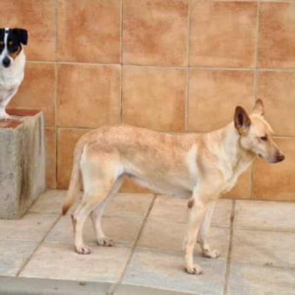 Cala hat sich vom ersten Tag an perfekt in den Tierheimalltag mit all seinen Abläufen angepasst und ist bestens in das große Hunderudel integriert. Sie präsentiert sich bei uns als sehr angenehme, stille Hündin, die man so gut wie nie hört. Cala benimmt sich stets höflich und respektvoll gegenüber Personen und anderen Hunden; aufdringliches oder laut tobendes Verhalten entspricht überhaupt nicht ihrer kleinen Welt. Obwohl sie ein Podenco-Mischling ist, zeigt sie hier bei uns ein ausgeglichenes Wesen mit angenehmem mittlerem Energieniveau. Vormittags während dem Saubermachen der Zwingeranlage dürfen alle Hunde gemeinsam nach draußen in den großen Auslauf, und hier dreht sie in aller Seelenruhe ihre Runden, um sich anschließend auf einem schönen Sonnenplatz zu entspannen. Cala versteht sich sehr gut mit allen anderen Hunden und möchte mit nichts und niemandem Streit. Sie kann aber auch gut und gerne ihr kleines Leben alleine genießen. Am gemeinsamen Spiel hat sie aktuell noch nicht viel Interesse; auf Spielen mit Spielzeugen wird sie so langsam neugierig (siehe Video) und ist aber kein Balljunkie. Bei kleinen Übungen auf dem Tierheimgelände läuft sie entspannt an der Führleine; man merkt, dass sie Spaziergänge kennt.