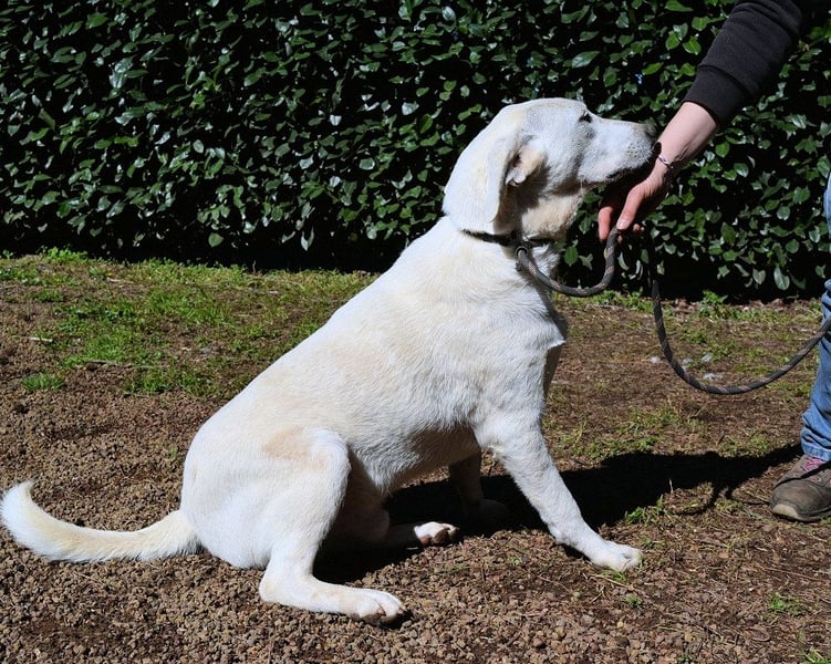 Er lebt aktuell in einer gemischten Box mit Rüden und Hündinnen und zeigt sich dort freundlich, souverän und sozial. Doch draußen, in der unbekannten Welt, ist plötzlich vieles nicht mehr so leicht. Neue Situationen verunsichern ihn. Er weiß nicht, was er tun soll, schaut dann hilfesuchend nach oben – als würde er fragen: „Sag du mir, wie das geht.“