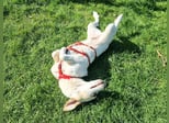Deddy sieht seinem Bruder Peppino übrigens zum Verwechseln ähnlich, beide haben kurzes, fast weißes Fell und etwas dunklere «Sommersprossen» auf dem Nasenrücken. Und beide haben braune Öhrchen, allerdings sind die von Deddy etwas dunkler als die von seinem Bruder. Sowohl Deddy als auch seine Mama und die zwei Geschwister haben eine verkürzte Rute - ob kupiert oder so geboren, können wir zum aktuellen Zeitpunkt nicht sagen. Nach Österreich und in die Schweiz ist die Einfuhr von Hunden mit kupierten Ruten jedenfalls verboten.