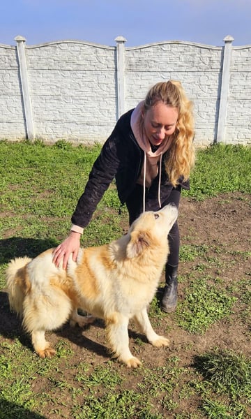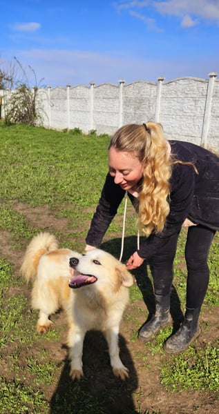 Mit anderen Hunden zeigt er sich verspielt, sozial und gut verträglich. Besonders im Freilauf kann er für einen Moment den Shelteralltag vergessen, ist sehr aktiv und zeigt seine lebensfrohe Seite.