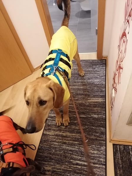 Besonders berührend ist seine empathische Art: Er gibt einem noch unsicheren Hund auf der Pflegestelle spürbar Halt, als wolle er Mut machen.