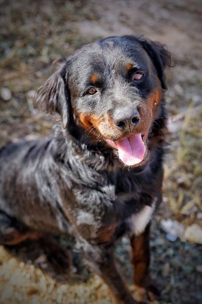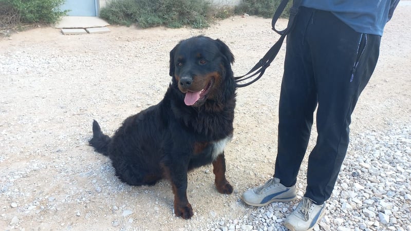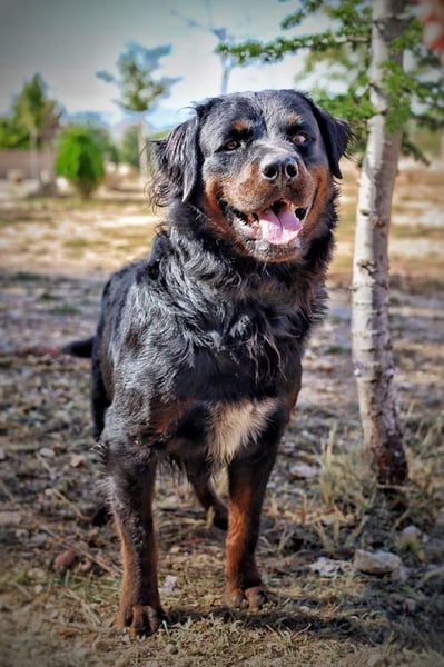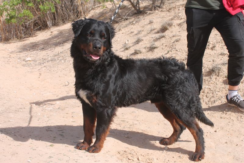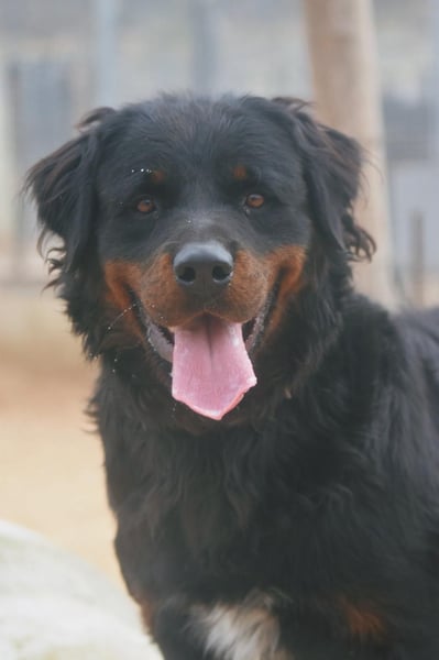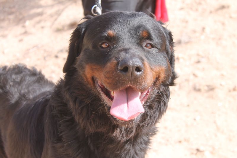 Bear zeigt viele Merkmale eines Rottweilers, allerdings vermuten wir, dass noch eine andere Rasse mit im Spiel ist – eventuell ein langhaariger oder kräftigerer Typ wie Berner Sennenhund oder Retriever. Ein DNA-Test liegt nicht vor, daher können wir es nur anhand seines Aussehens vermuten.