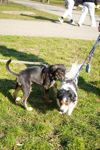 Auch mit anderen Hunden versteht sich Boston sehr gut. Sowohl im Haus als auch draußen spielt er gerne mit ihnen und ist immer freundlich. Auch an der Leine möchte er andere Hunde häufig begrüßen und im Hundepark hat er sehr viele Freunde. Wenn er ohne Leine unterwegs ist, beispielsweise im Wald, orientiert er sich meist an den anderen Hunden und den Menschen.