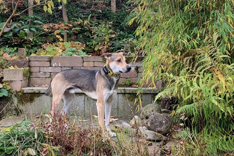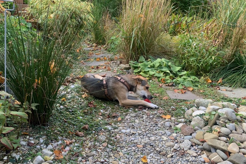 Trusky erkundet begeistert und neugierig den Garten und lässt sich auch durch Umgebungsgeräusche wie Motorrasenmäher o. Ä. nicht mehr beeindrucken.