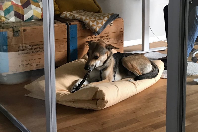 Im Haus findet er inzwischen gut selber zur Ruhe. Besuch oder den Postboten kündigt er durch Bellen an, lässt sich aber bereitwillig auf seinen Platz schicken. Ansonsten ist er kein großer Beller und lässt sich auch von anderen Hunden nicht anstecken. Im Homeoffice erweist er sich als ruhiger Mitarbeiter.