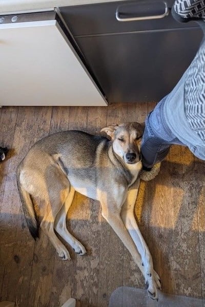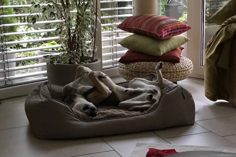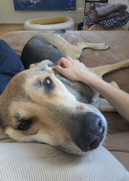 Im Haus findet er inzwischen gut selber zur Ruhe. Besuch oder den Postboten kündigt er durch Bellen an, lässt sich aber bereitwillig auf seinen Platz schicken. Ansonsten ist er kein großer Beller und lässt sich auch von anderen Hunden nicht anstecken. Im Homeoffice erweist er sich als ruhiger Mitarbeiter.