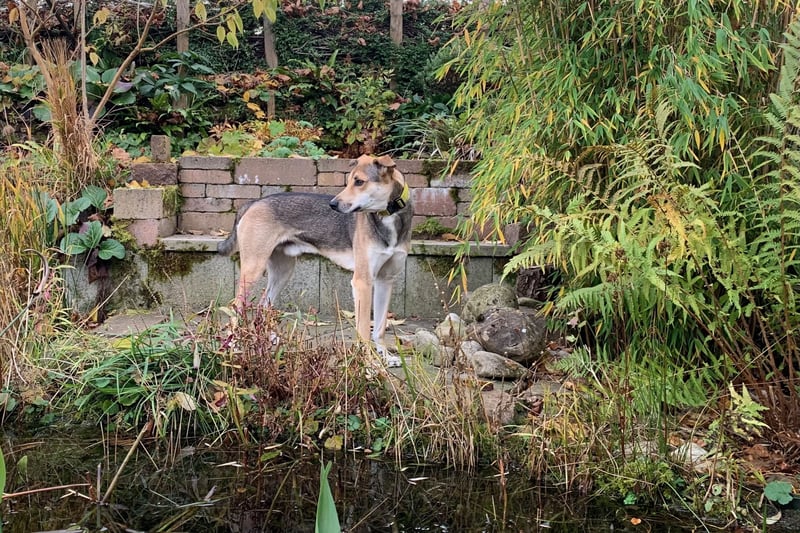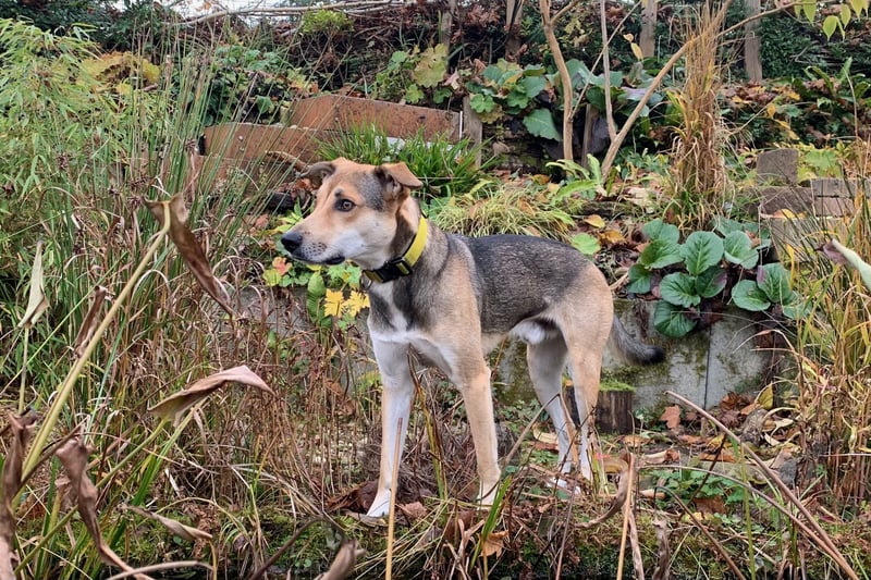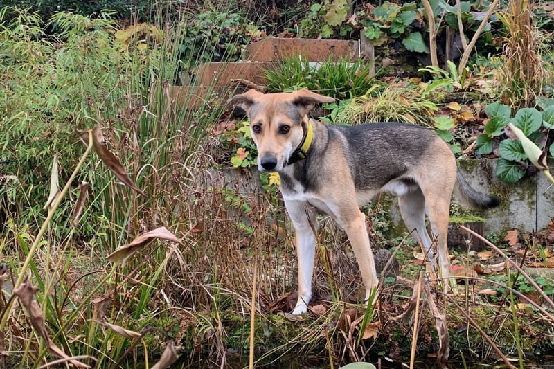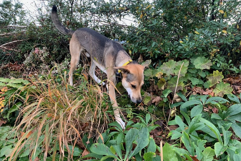 Trusky erkundet begeistert und neugierig den Garten und lässt sich auch durch Umgebungsgeräusche wie Motorrasenmäher o. Ä. nicht mehr beeindrucken.