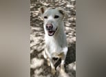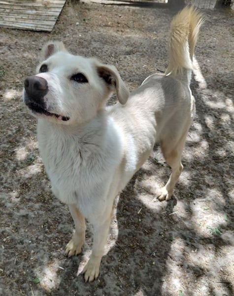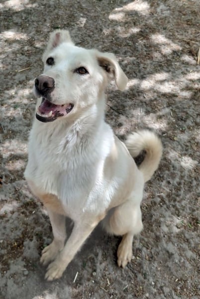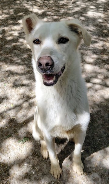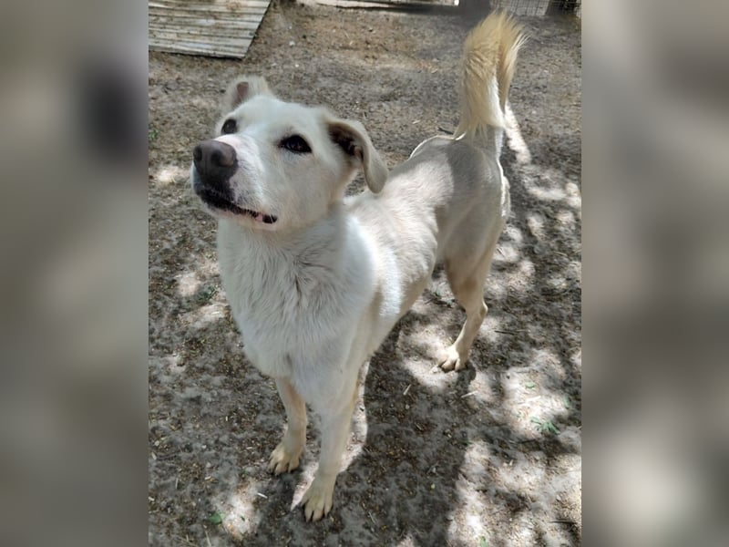 Fleur zeigt sich als freundliche, verspielte und neugierige Hündin, die es sichtlich genießt, nun regelmäßig zu essen und mit Pepe im Freilauf herumzutollen. Fleur fehlt ein kleines Stück am rechten Ohr.