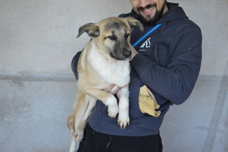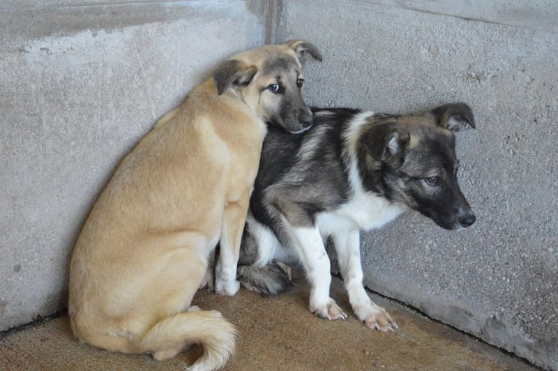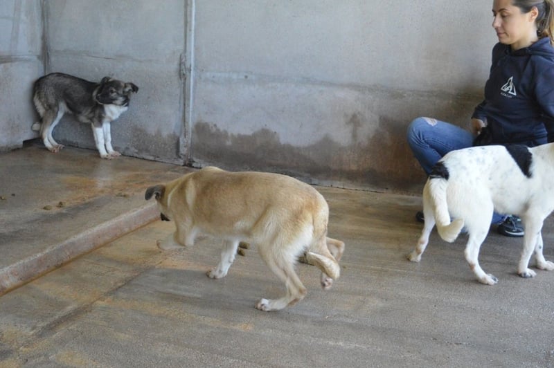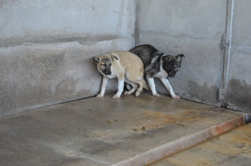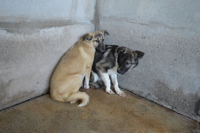 Unsere vier Hundekinder scheinen bislang noch nicht sehr viele Begegnungen mit freundlichen Zweibeinern gehabt zu haben. Bei den Besuchen der mit uns befreundeten Tierschützer im November 2025 zeigten sich alle vier schüchtern, vielleicht sogar ein wenig ängstlich. Es sind keine Angsthunde, aber sie kennen Berührungen, die Leine oder einfach nur die Gegenwart von Menschen, die es gut mit ihnen meinen, nicht. Aber keiner von ihnen hat Aggressivität gezeigt, weder die eine noch der andere hat zum Beispiel bei Berührung zu schnappen versucht, wie das einige Hunde aus Angst oder Unsicherheit tun. Nein, Quivira und ihre Geschwister haben Fluchtwege gesucht, sind unter den Trinkeimer gekrochen oder haben sich hinter einem ihrer Zellengenossen versteckt.