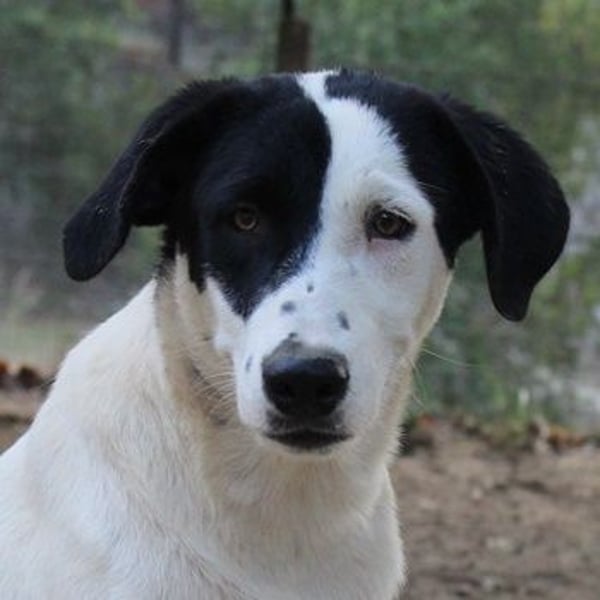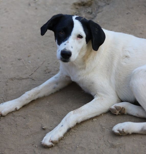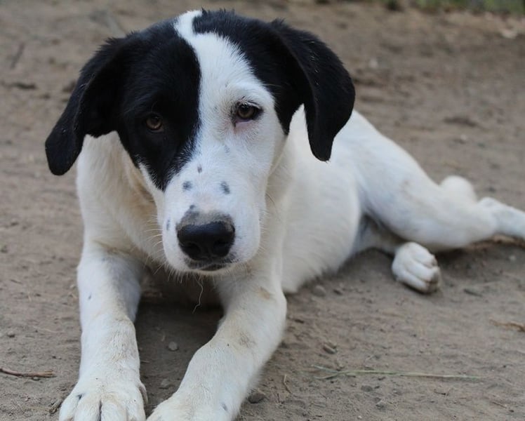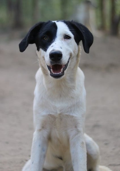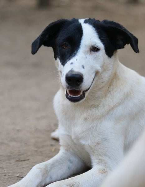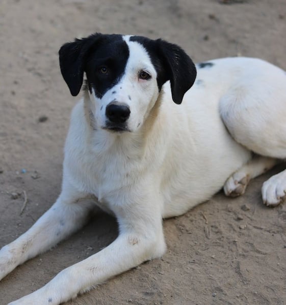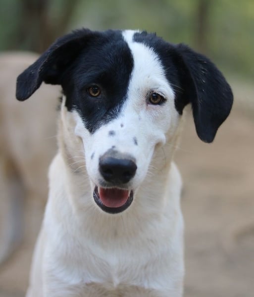 Indonesia ist ein echter Hingucker! Die schöne Hündin hat ein schneeweißes Fellkleid, welches einen tollen Kontrast zu der schwarz-weißen Maske in ihrem Gesicht bildet. Außerdem hat sie eine gefleckte Nase und große, dunkle Augen.