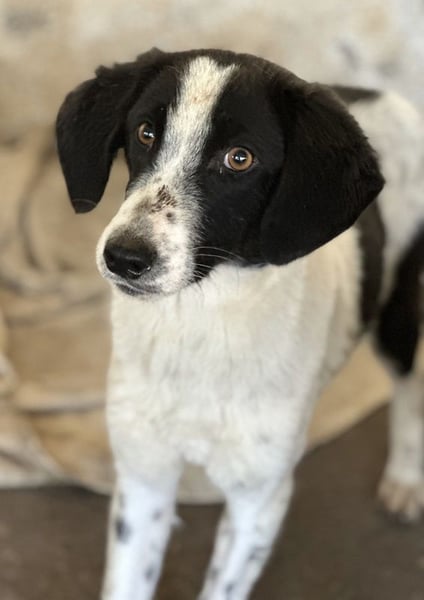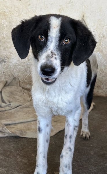 Amora ist eine hübsche Hündin mit einem Fellkleid in Schwarz und Weiß. Ein besonderer Hingucker sind die schwarzen Tupfen an den Vorderbeinen und auf der Schnauze. Amora ist von einem unterernährten Welpen zu einer schönen Hündin mittlerer Größe herangewachsen.
