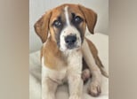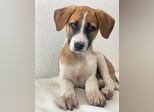 Juno ist ein Welpe, die ausgewachsen voraussichtlich etwa 55 cm groß werden wird. Sie hat ein ausdrucksstarkes Gesicht und wirkt dennoch sehr sanft. Ihr Fell ist kurz und glatt, in einem warmen Braunton mit weißen Abzeichen. Besonders auffällig ist die weiße Gesichtszeichnung.