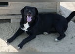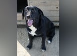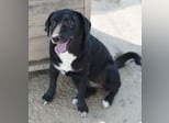 Ria ist eine charmante Hundedame mit schwarzem Fell, das einige weiße Akzente aufweist.