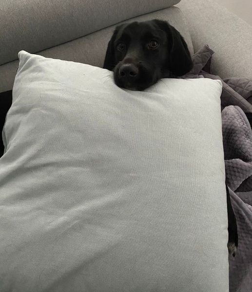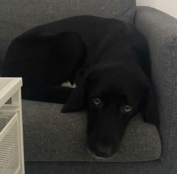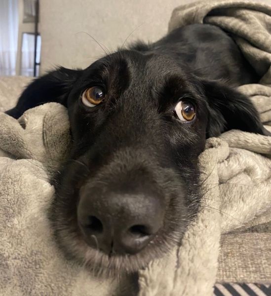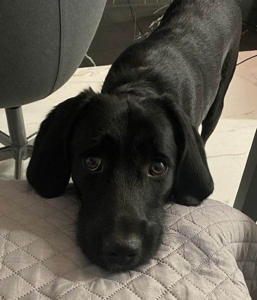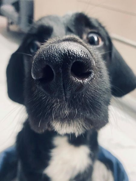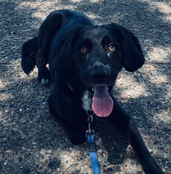 Emrys ist ein wunderschöner Rüde. Sein Fell ist glänzend schwarz, und er hat sehr süße Schlappohren. Außerdem ziert ein großer weißer Fleck seine Brust.