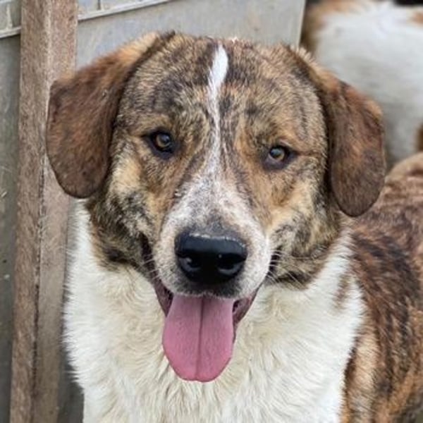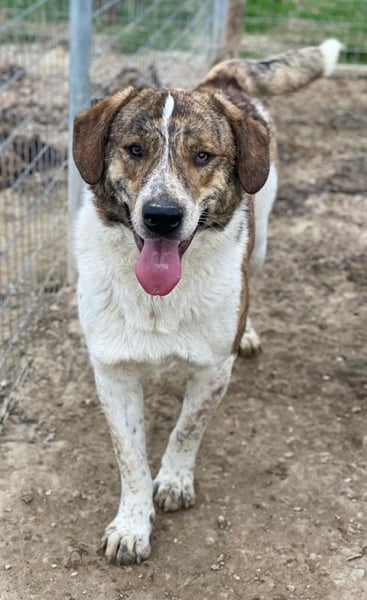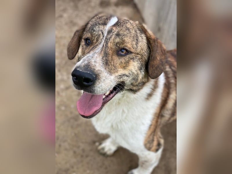 Timo ist zu einem großen Rüden herangewachsen, der mit einem wunderschönen Fell sowie einem sanften Blick sofort auffällt. Sein Fell ist eine Mischung aus braun-gestromtem und weißem Fell, was ihm ein einzigartiges Aussehen verleiht.