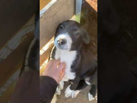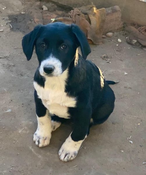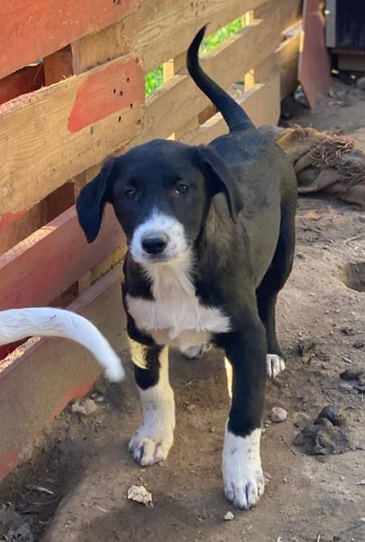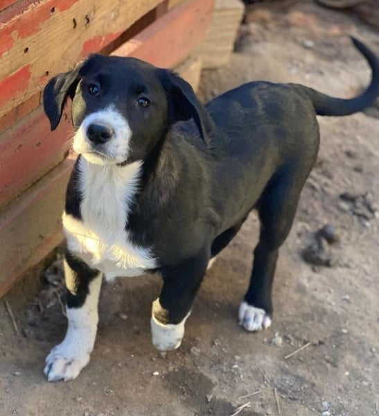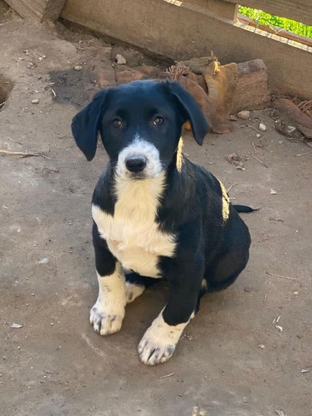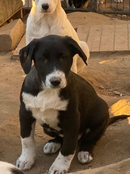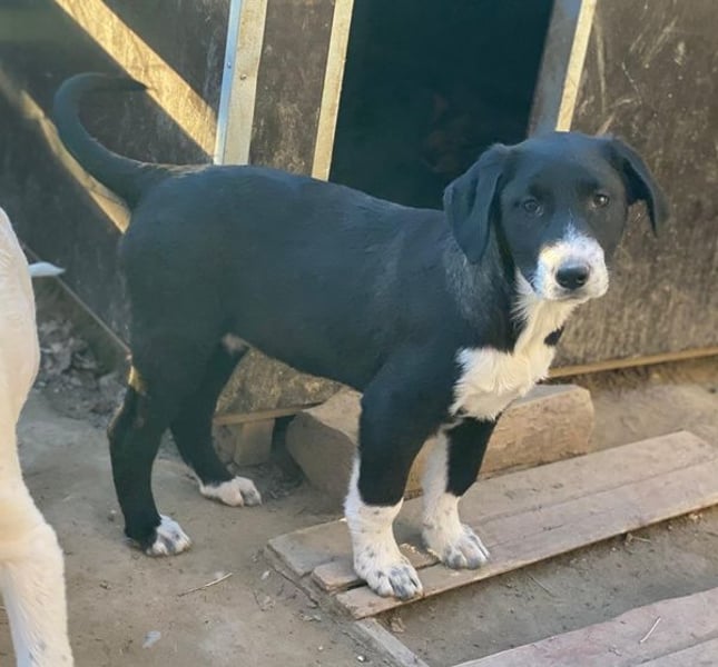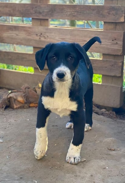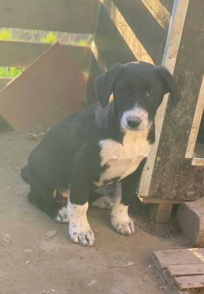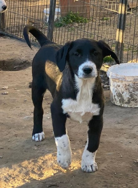 Pinot Noir ist ein hübsches, schwarz-weißes Hundemädchen mit einer tollen Fellzeichnung. Zudem trägt sie weiße Söckchen, was ganz besonders süß ist.
