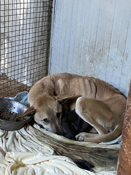 Vorgeschichte: Unsere Leni haben wir Anfang März 2025 dramatisch unterernährt aus der Tötung gerettet, am gleichen Tag hat sie dort ihre 8 Welpen zur Welt bringen müssen. 6 davon haben diese schrecklichen Umstände nicht überlebt