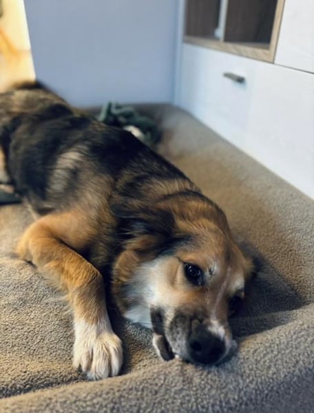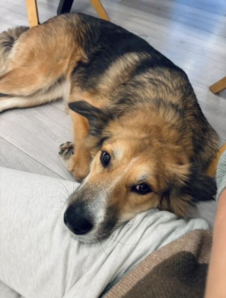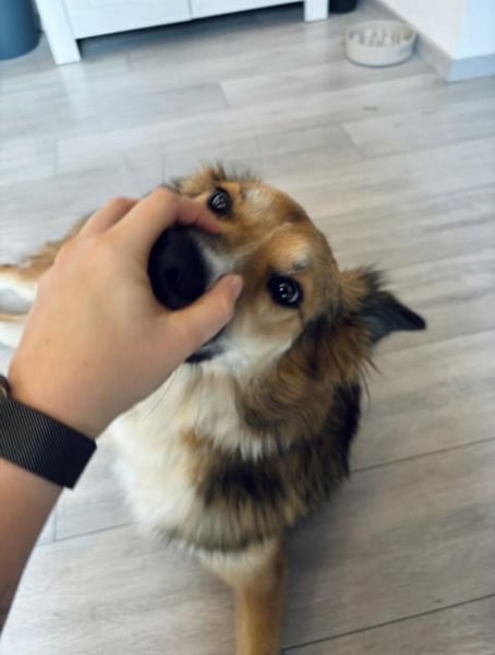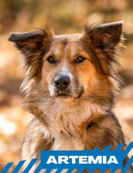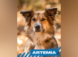 Artemia wurde im Juli 2025 in einem sehr erbärmlichen Zustand neben einem Müllcontainer gefunden – sie war dünn, schmutzig, hatte offenbar gerade Welpen bekommen und schien auf den ersten Blick keinen Lebenswillen zu haben. Mehrere Menschen fütterten sie und suchten unterdessen nach einer Möglichkeit, sie irgendwo unterzubringen. Später stellte sich heraus, dass sie sechs Welpen hatte und auf einem Hof an einer nicht länger als einen Meter langen Kette lebte, die sich schmerzhaft in ihren Hals grub.