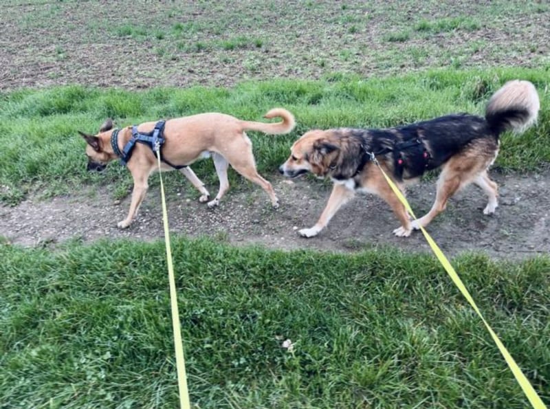 Beim Spaziergang durch die Stadt ist sie noch sehr aufgeregt und zieht entsprechend an der Leine – daran wird aber bereits super gearbeitet. Sobald es in den Wald geht, ist sie wieder tiefenentspannt und trottet genüsslich durch die Gegend.