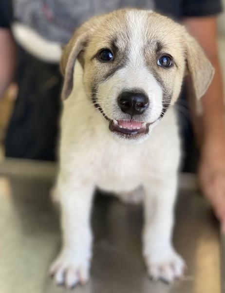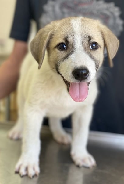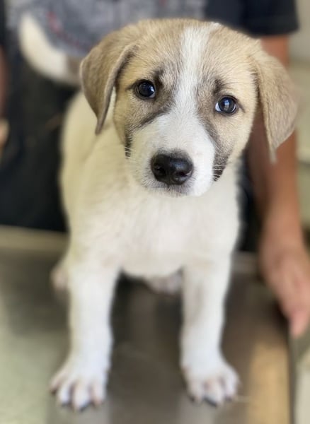 Der süße Anakyn hat überwiegend weißes Fell mit einem kleinen, hellbraunen Fleck auf dem Rücken. Er hat wunderschöne, dunkle Augen mit einem freundlichen und liebevollen Blick. Sein Gesicht ist wie eine Maske gezeichnet und seine Augenbrauen sind dunkel gefärbt, sodass es den Anschein erweckt, sie wären gefärbt.