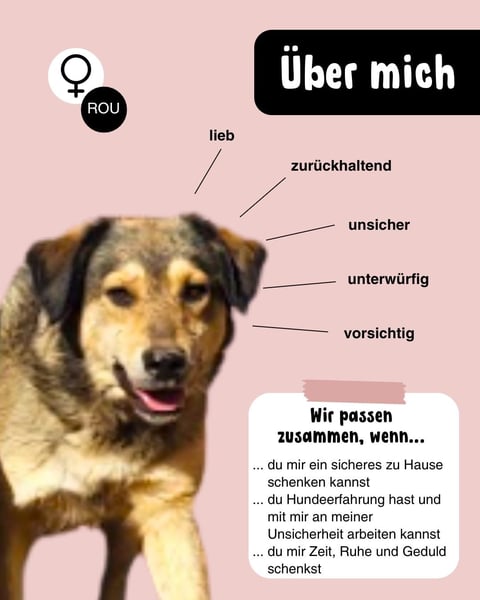 Daher brauche ich Menschen, die Hundeerfahrung haben und verstehen, wie ich ticke und wie man mit einem unsicheren Hund wie mir umgeht. Ich bin eine zurückhaltende Hündin, die nie die Möglichkeit hatte, richtig aus sich herauszukommen. Wenn du bereit bist, mir eine Chance zu geben und mir die Liebe und Fürsorge zu schenken, die ich so sehr verdiene, dann melde dich bitte. Ich kann es kaum erwarten, mein neues Leben mit dir zu verbringen und gemeinsam viele Abenteuer zu erleben.