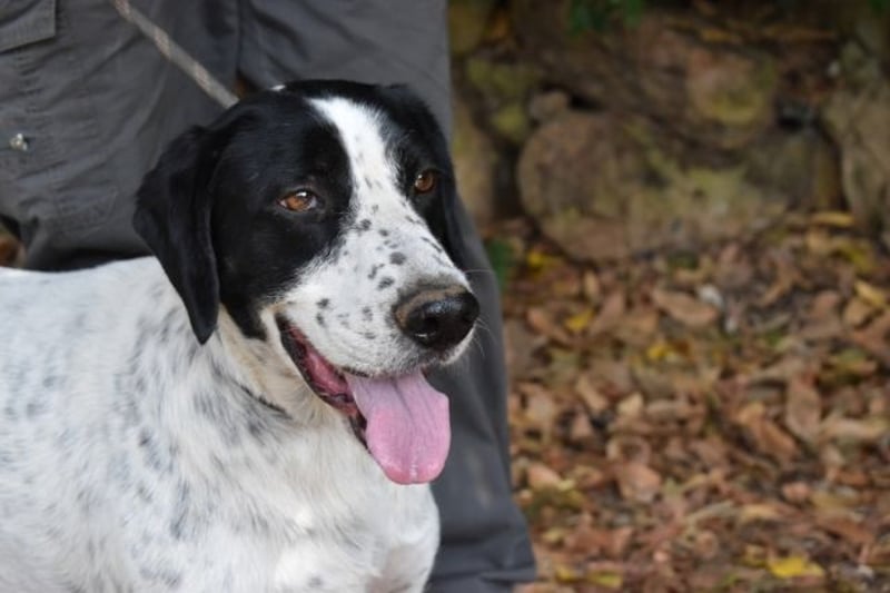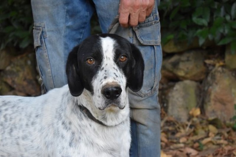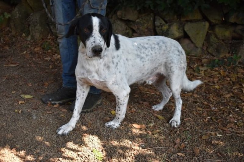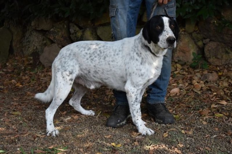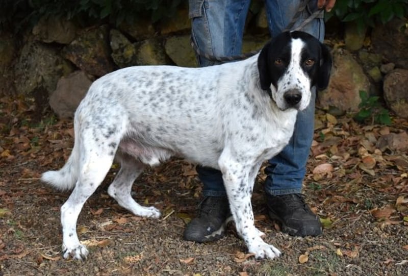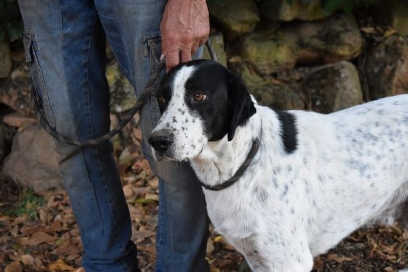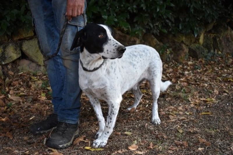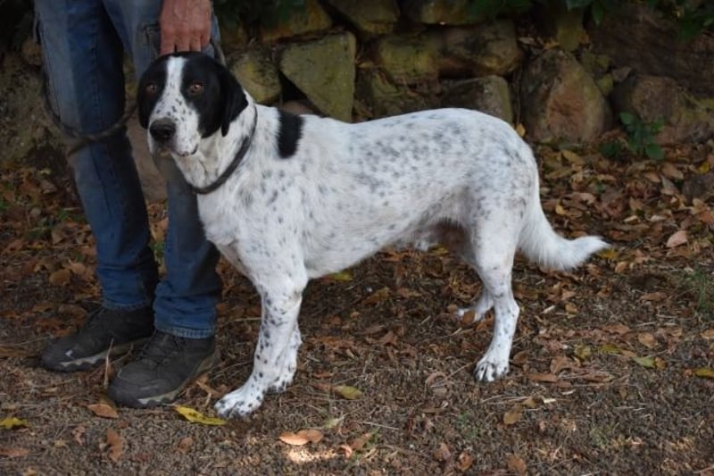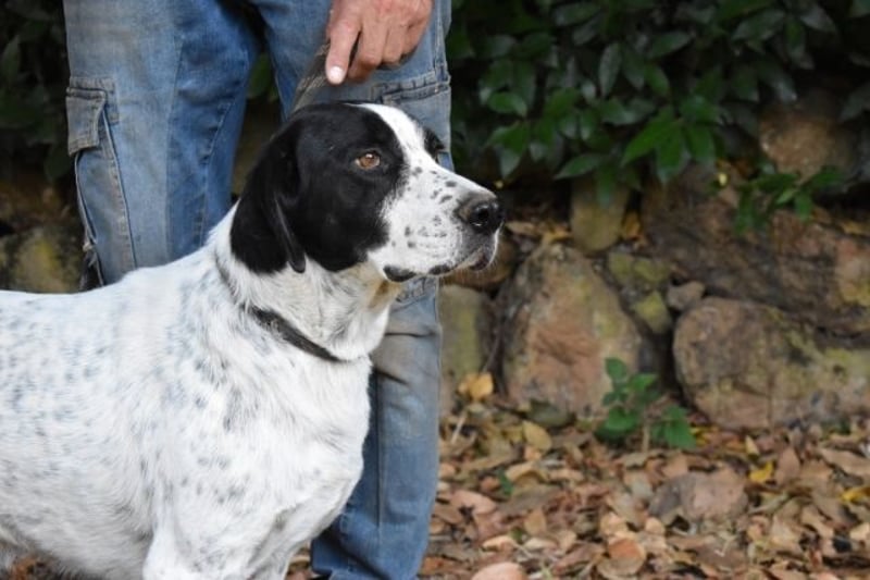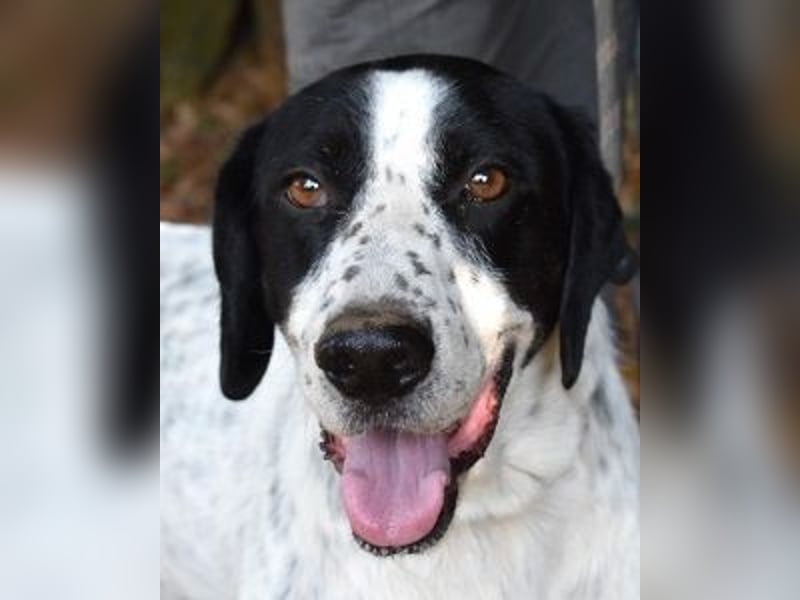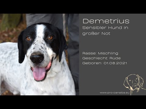 Ein über und über gesprenkeltes, kurzhaariges Fell, schwarz auf weiß; eine schwarze, fast symmetrische Maske rund um die haselnussbraunen Augen, die Ohren ebenfalls schwarz; auf der Nase schwarze Pünktchen auf weißem Fell: Das ist unser wunderschöner Demetrius. Die Sprenkel und Punkte sind vielleicht einem Setteronkel geschuldet, welche anderen Rassen oder wilden Mischungen noch ihre Gene gespendet haben, wissen wir leider nicht. Aber wir sehen einen bildhübschen Rüden vor uns, in dem enormes Potential steckt. Und wir sehen einen Hund, der sein aktuelles Leben fast nicht aushält. Demetrius ist ein Notfall, wir sind auf der dringenden Suche nach Menschen, die ihm endlich eine Chance auf ein Leben, ein richtiges Leben, geben.