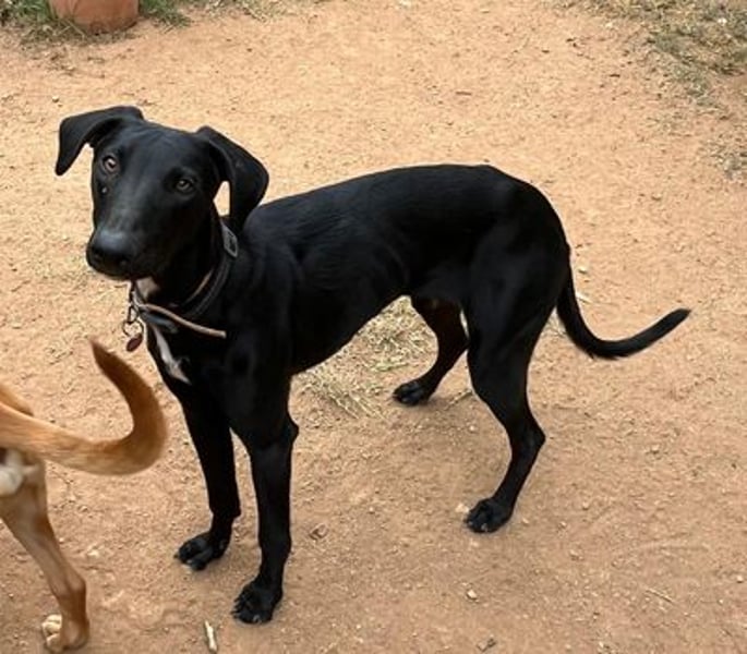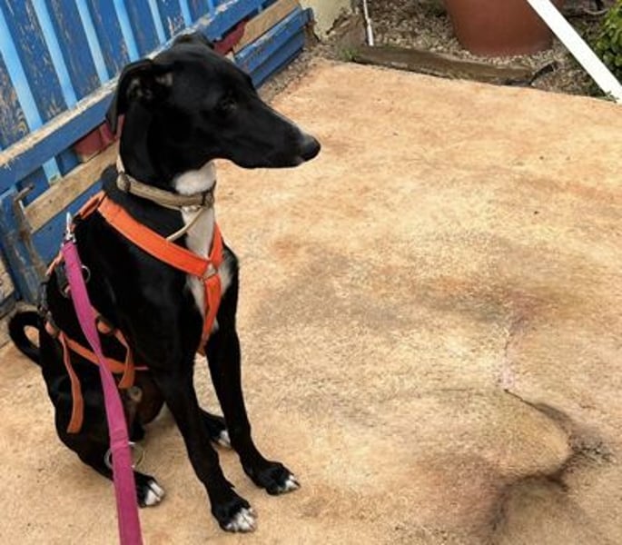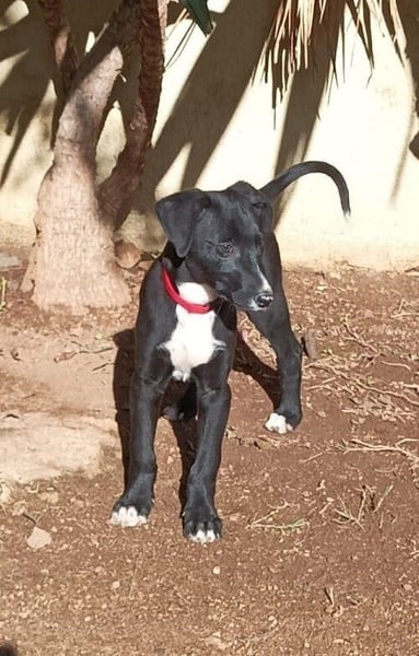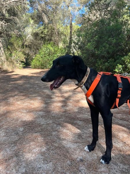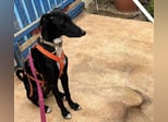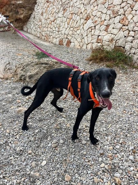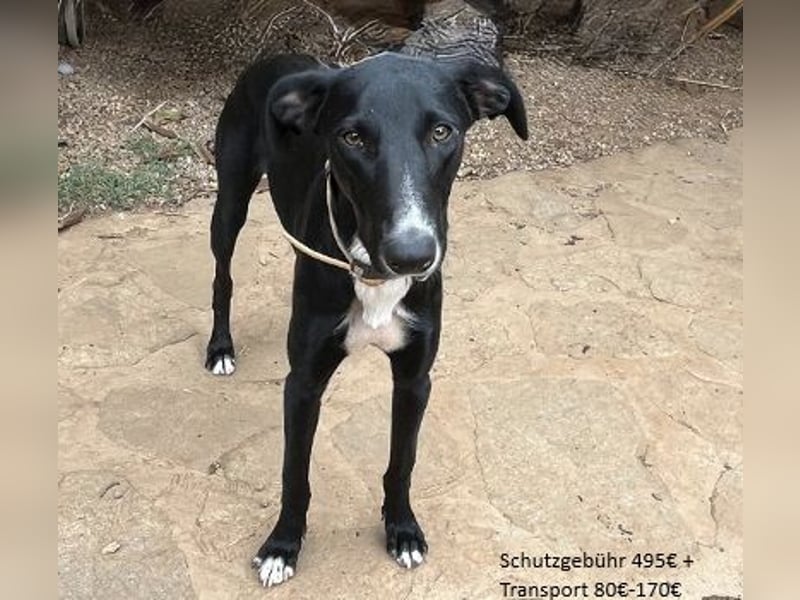 Der hübsche Galgo-Mix Xavi ist mittlerweile 56 cm groß, wiegt ca. 19 kg und ist ein fröhlicher, lauffreudiger Rüde.