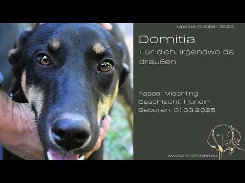 Die hübsche Domitia wurde am 1. März 2025 geboren und kam am 14. Juni 2025 gemeinsam mit ihren drei Schwestern Damiana, Drifa und Djamica ohne ihre Mutter in ein Canile. Sie ist aktuell etwa 47 cm groß (Stand Juli 2025) und wird zu den mittelgroßen bis großen Hunden zählen.