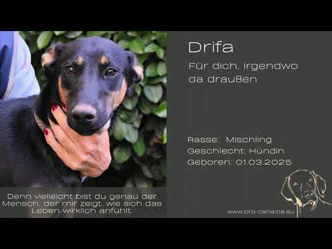 Die kleine Drifa kam am 14. Juni 2025 gemeinsam mit ihren drei Schwestern Domitia, Damiana und Djamica ohne Mutter in ein Canile. Geboren wurde sie am 1. März 2025, und aktuell misst sie (Stand Juli 2025) etwa 45 cm – sie wird also zu den mittelgroßen bis größeren Hunden gehören.