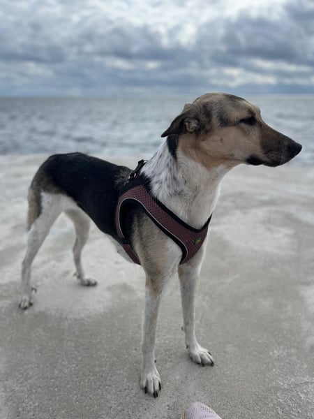 Luffy ist eine mittelgroße Mischlingshündin mit Hütehund-Anteil und schlanker, sportlicher Figur. Sie wurde als Welpe in Rumänien gefunden und liebevoll aufgepäppelt. Heute ist sie ein fröhliches, aktives und sehr soziales Energiebündel.