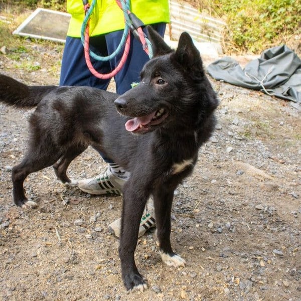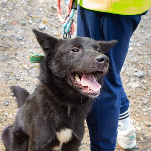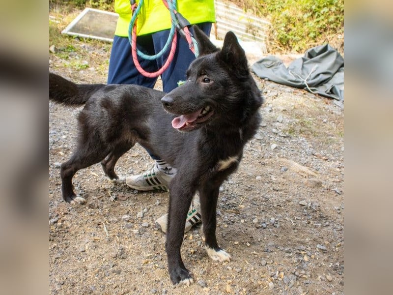 Randy kam im Jahr 2023 als etwa acht Monate alter Mischlingsrüde zu uns ins Tierheim. Er war bei seiner Ankunft also schon kein winziger Welpe mehr. Über seine Vergangenheit wissen wir leider nicht viel, doch eines wurde sofort klar: Randy ist ein ganz besonderer Hund. Ausgewachsen wird er schätzungsweise zwischen 17 und 22 kg wiegen. Mit seinen großen, spitzen Ohren, dem tiefschwarzen Fell, dem weißen Brustfleck und den kleinen weißen „Söckchen“ an den Pfoten ist er ein echter Hingucker.