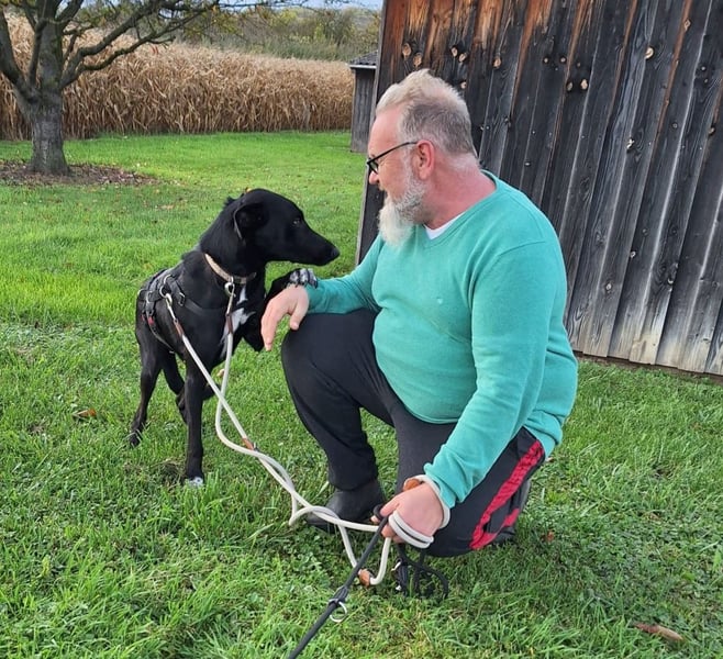 Pino lebt jetz auf einer Pflegestelle in Süddeutschland, wo er nun mit Ruhe und Geduld Schritt für Schritt Vertrauen fasst.